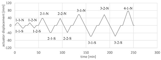 The loading protocols were set up according to the known load history from [19]. A displacement control was chosen based on the actuator displacement in order to take into account both displacements, from the cantilevered and clamped parts of the wall, and to have a safe control system. This may result in certain deviations from a measurement based purely on the wall displacements. The loading protocol for NW 1 is given in Figure 7. The load stages are: cycle 1 = 0.75Fy; cycle 2 = δact(0.75Fy)·4/3·2; cycle 3 = δact(0.75Fy)·4/3·3. δact is the actuator displacement. For each load stage, two cycles are driven, e.g., in stage 1, cycle 1-1 and cycle 1-2. The same load steps were applied to NW 2. In the case of NW 3, only two load stages were run since failure had already occurred in the second load stage. In the first cycle of each load step (cycle X-1), the actuator was stopped, cracks were signed and pictures were taken at the maximum north and south deflection. The interruption of the load application is represented by a horizontal line in the loading protocol.