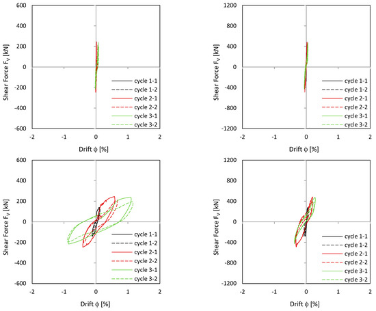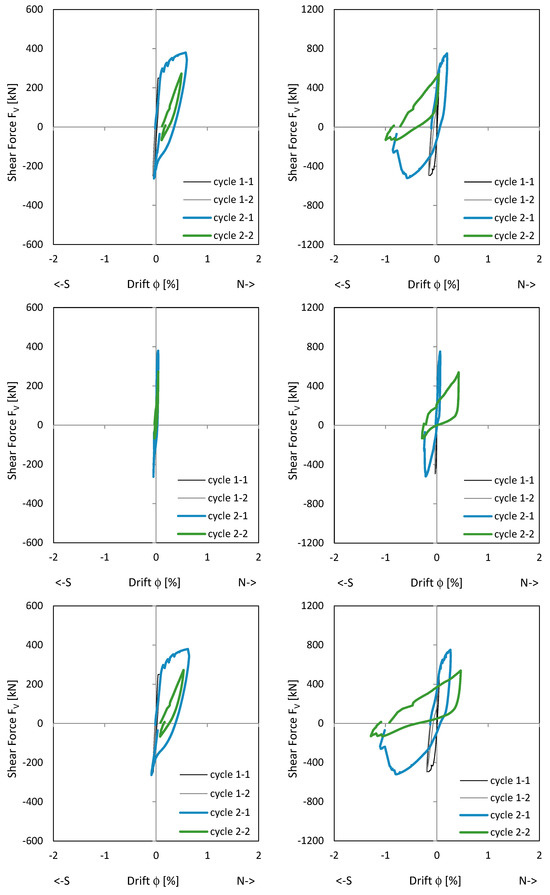 Load–drift curves of NW 1: flex cantilever (top left), flex clamping part (top right), sliding shear cantilever (middle left), sliding shear clamping part (middle right), total cantilever (bottom left), and total clamping part (bottom right).