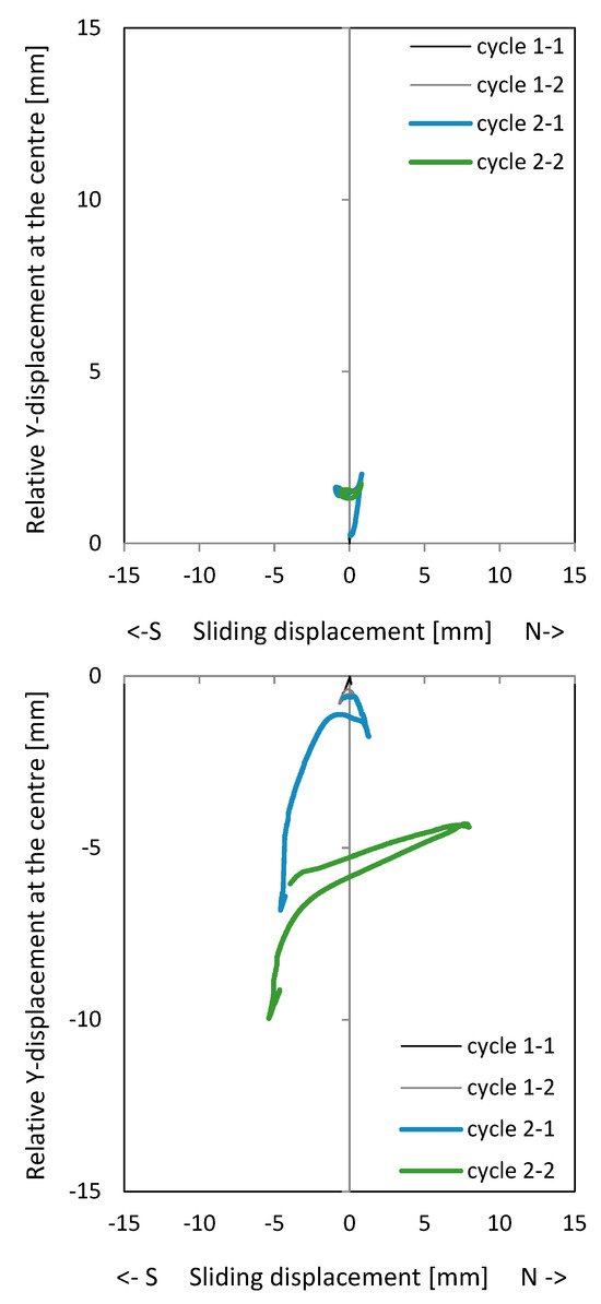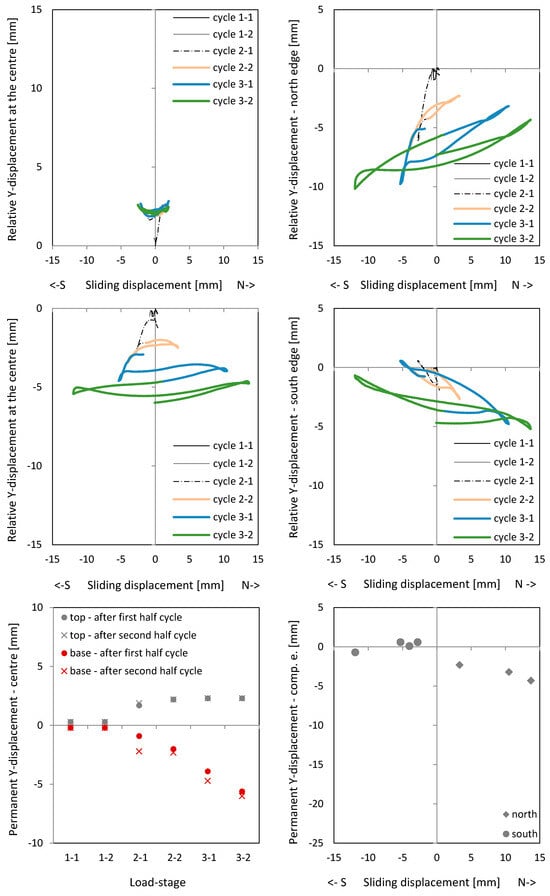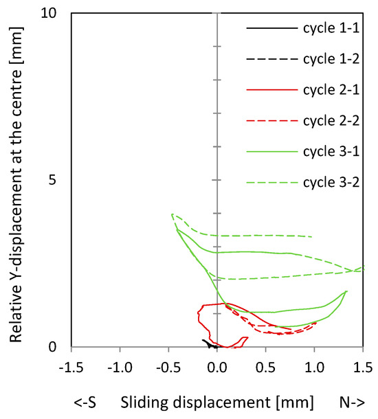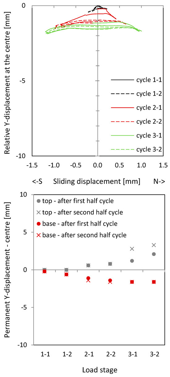 Relative Y-displacement (over a length of 200 mm) to sliding displacement curves in the centre of NW 3: above the ceiling plate (top); below the ceiling plate (middle); permanent relative Y-displacement (over a length of 200 mm) in the centre after the cycle (bottom).