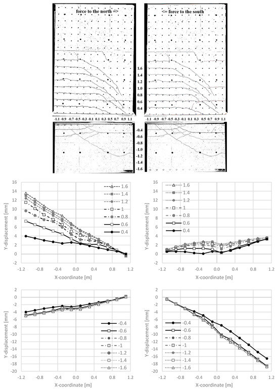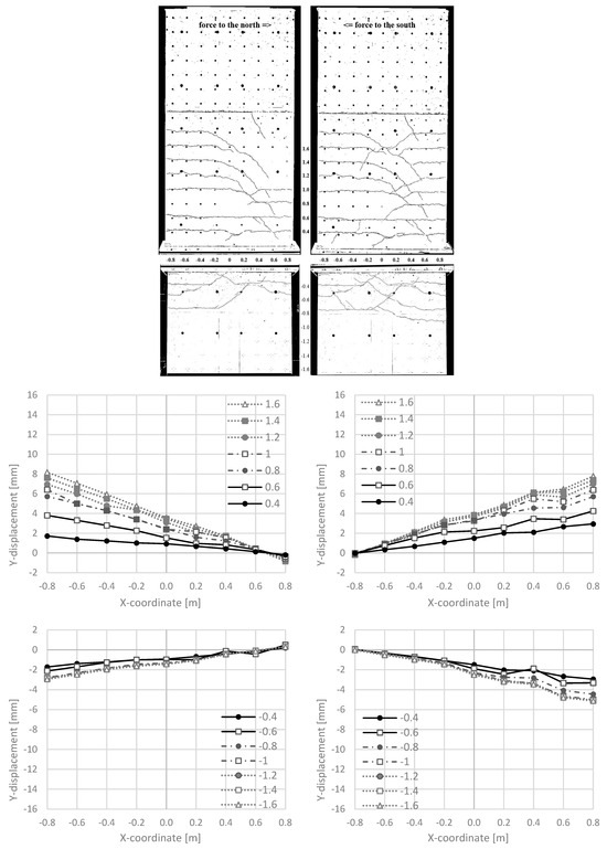 NW 1 in cycle 2-1: to the north (left) and to the south (right): crack pattern (top), Y-displacements along different horizontal sections [m] in the cantilever part (middle) and the basement part (bottom).