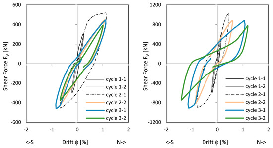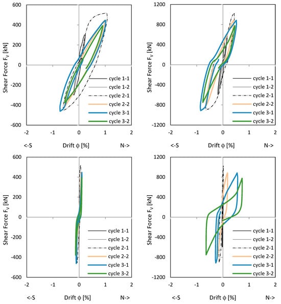 Figure 11 shows the load–drift relationships. The picture in the middle right shows the drift from sliding shear in the clamped wall section. First, sliding shear displacements occur already in cycle 2-1 with the load to the south. After the construction joint in the south edge of the wall is opened under a load to the north, the first sliding shear drift occurs when the wall is loaded in the reverse direction. The crack in the south does not close completely and the basement wall slides to the south at the construction joint. In the following cycles, the joint opens successively and the sliding shear displacement becomes more and more pronounced. This is addressed Section 3.2.2. In cycle 3-2, the drift from sliding shear develops up to a drift of 0.7% and the strength drops down to approx. 80% of the maximum value. Figure 11 top shows that the main flexural + tension shift displacements already occur in cycle 2-1. The following cycles, which are shown in colour, show no pronounced increase in the flexural + tension shift displacements. The wall begins to slide and loses its clamping load-bearing capacity in the basement; horizontal stabilisation of the building is no longer possible with the wall.