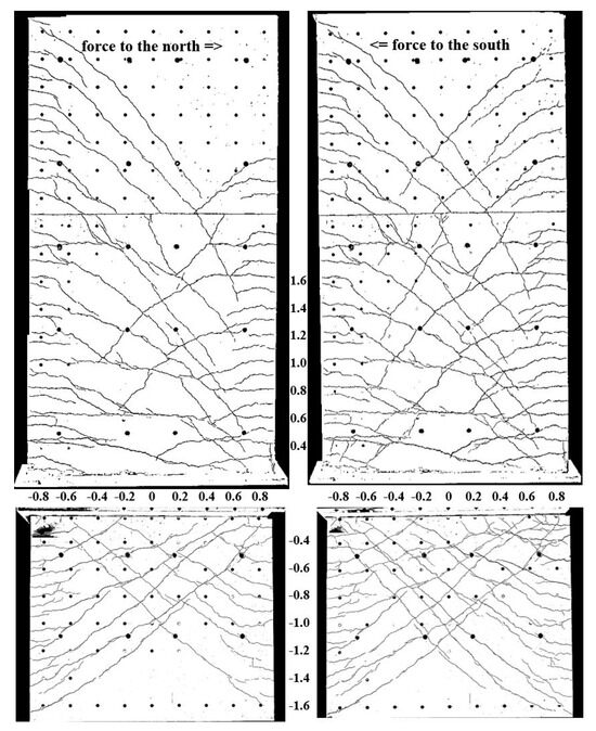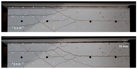 Nearly equal lengthenings of about 4 mm occurred above and below the ceiling cutout in cycle 2-1-N (X = −1.1 m section and Y = 0.4 m/Y = −0.4 m in Figure 17 bottom left). For the subsequent cycle to the south, 2-1-S, a large single crack of about 16 mm occurred in the clamping part (X = 1.1 m section and Y = −0.4 m in Figure 17 bottom right). As for NW 2, the cracks did not close completely in the compression zone. Sliding shear failure occurred due to the reduced aggregate interlock resistance.