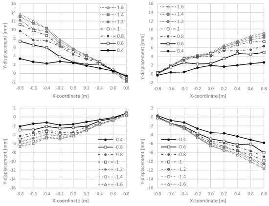 With eight cameras, the displacement field is measured over the total wall. Thus, reflectors are glued on the wall with horizontal and vertical distances of 200 mm between them. Figure 4 right shows the grid. The reflector points on the ceiling cutout could not be used because they were partially obscured by the steel structure. For the middle axis position, displacement measurement of the displacement transducers was used. The system can measure displacements in the X-, Y-, and Z-directions; for the displacement field, the X- and Y-directions (vertical plane) are needed. In this publication, the vertical displacements around the ceiling cutout are analysed along the red dashed lines in Figure 6.
