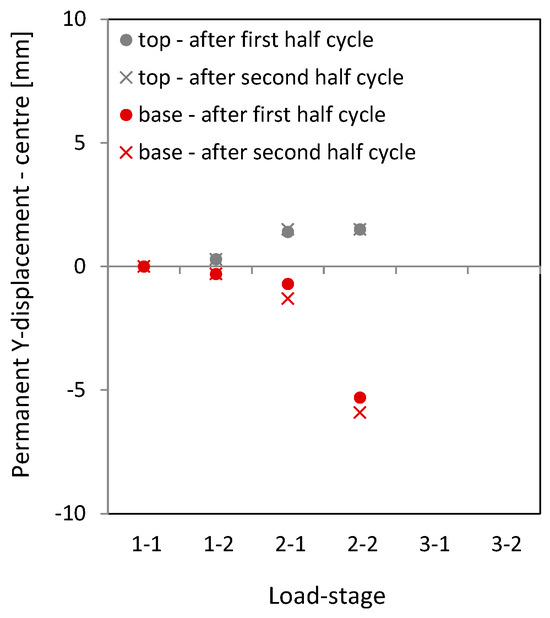 Figure 13 shows the crack patterns. Compared to NW 1, more cracks occur, more cracks are inclined and, in the boundary element, secondary cracking occurs. The load capacity is more than twice that of NW 1, leading to this difference. A detailed analysis of these observations is performed in a separate publication [18]. In the publication here, the construction joint above and below the ceiling cutout is of interest to analyse sliding shear failure. Figure 13 (middle left and bottom left) shows the Y-displacements in cycle 2-1 for loading to the north. The lengthening on the tension side (x = −0.8 m) is ~2 mm in the clamped part, smaller than in the cantilevered part with ~3 mm. In this half cycle, no sliding shear displacements occur. In the following half cycle to the south—Figure 13 (middle right and bottom right)—the lengthening in the tension zone (x = 0.8 m) is substantially greater: ~6 mm in the clamped part and ~2.5 mm in the cantilevered part. The compressing of it in the compression zone (x = −0.8 m in Figure 13 bottom right) is a little smaller than in the previous cycle (x = 0.8 m in Figure 13 bottom left). This is one reason why sliding shear displacements start at this load stage (cp. Figure 11 (middle right)). One can also see that the Y-displacements in the sections where Y = −0.4 m are significantly greater than for the adjacent sections, Y = −0.6 m and −0.8 m. This further favours sliding shear failure in the construction joint.