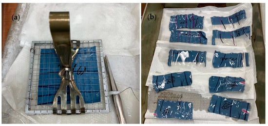 One of the goals of this research was to determine the operational properties of the film. The samples of the film had thicknesses of 0.046 mm (0rLDPE/100LDPE) and 0.045 mm (0rLDPE/100LDPE). The samples were obtained from a company producing heat-shrinkable films. The basic source of information about the mechanical properties of plastics is the static tensile test. It involves axial stretching of material samples with precisely defined standardized shapes in holders. In the case of easily deformable materials, Young’s modulus is of theoretical importance. The actual stresses corresponding to the deformations that may occur during operation differ significantly from those that could be expected based on the elastic modulus. When characterizing the functional properties of polymer materials, the modulus of elasticity is often not provided; however, in this study, stresses corresponding to individual values of relative elongation are determined. Therefore, in the tests carried out, the relative elongation at the yield point, at maximum stress and at the breaking of the analyzed films was determined [26,27]. To determine the mechanical properties under static tension, tests were carried out according to the PN-EN ISO 527-1:2020 [28] and PN-EN ISO 527-3:2019-01 [29] standards. In the first step, 15 mm wide film samples were cut in the machine and transverse directions. The tests were carried out on a TIRAtest 27025 machine, TIRA, Schalkau, Germany. To determine the shrinkage of the film, a linear shrinkage test was carried out, which involved determining the changes that occur in the plastic material under the influence of temperature. This method is used to assess the suitability of a given heat-shrinkable film made of various plastics for packaging purposes. Tests were performed in accordance with ASTM D2732 [30], a standard test method for the unconfined linear thermal shrinkage of films using a Memmert machine with a bowl along with silicone oil. To carry out the test, samples with dimensions of 100 × 100 mm were prepared, with the longitudinal direction marked on them. The samples, placed in a special holder (Figure 1), were immersed in silicone oil at a temperature of 140 °C for 10 s. It was important not to hold the samples above the oil pan before immersion because of the possibility of premature shrinkage or annealing of the film. After 10 s, the samples were removed and placed on a tray to cool and drain excess oil. After the test, the linear dimensions of the samples were measured and recorded. Linear free-shrinkage testing in the longitudinal direction was performed in accordance with ASTM D2732.