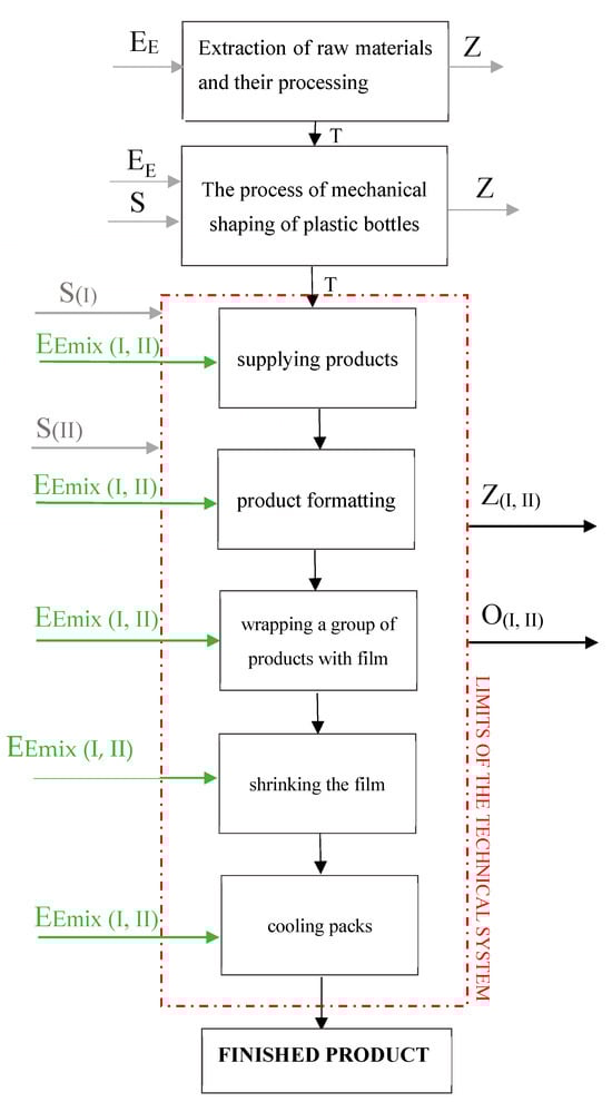 One of the main problems of the modern times is the production of too large amounts of harmful substances that exacerbate global warming, the depletion of the ozone layer and excessive amounts of landfill waste [1]. Manufacturing processes have an important role in the emission of pollution into the atmosphere. Work on reducing the harmfulness of these processes applies to every manufacturing company. The desired effect can be achieved through investments in companies, i.e., the purchase of a new packaging machine or reducing financial outlays by introducing changes in the smoothness of a process [1,2,3]. Reducing the harmfulness of the process of the mass packaging of bottles in heat-shrinkable film is associated with obtaining useful and useless products of the process, which are packs of bottles. Increasing the amount of useful products contributes to increasing the efficiency of the process, but also to reducing the demand for energy and to reducing the amount of waste generated in the mass packaging process, i.e., ultimately to minimizing the harmful impact on the technical system [4,5,6]. The process of the bulk packaging of bottles, like any process, also has a significant impact on the environment. Therefore, it is considered appropriate to search for both a highly efficient and a less harmful variant of this process.