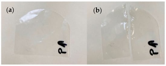 Film samples before (a) and after (b) tearing strength determination, the P marking and the arrow indicating the transversely direction of the sample example (own study).