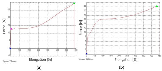 Example of a force-relative elongation diagram during a static tensile test in the Longitudinal direction: (a) 0rLDPE/100LDPE white film, (b) 50rLDPE/50LDPE white, pink point show the elongation at yield point, blue points show point for zero force and green points show forces to break the sample (own study).
