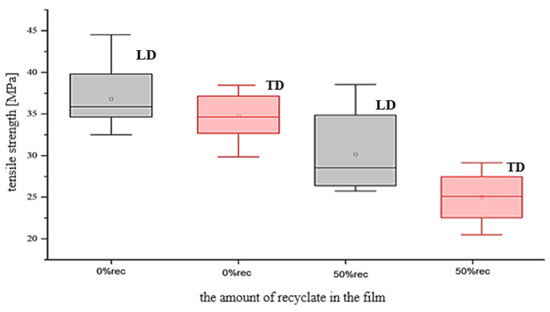 Using one-way analysis of variance (ANOVA), we checked whether the percentage of recyclate in the film composition affects the tensile strength in the machine direction. The results showed that the content of recyclate in the composition of the film affects the tensile strength in the machine direction—significant statistical differences in the means were obtained (Figure 5). It was noticed that an increase in the content of recyclates in the composition of the film reduced its strength properties. Moreover, the stresses that destroyed the film sample were related to the direction of production [42]. This research has shown that in the longitudinal direction, consistent with the manufacturing process, these values were higher for both tested film samples.