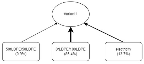As part of the analysis, raw material and media trees were created for the studied process variants. In variant I (Figure 8), the greatest potential contribution to negative impacts on the environment (85.4%) was demonstrated for the consumption of 0rLDPE/100LDPE film. Low values (0.938%) were recorded in this variant for the 50rLDPE/50LDPE packaging material. Electricity from the European energy mix in variant I was responsible for 13.7% of all negative impacts.