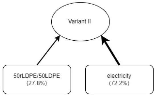 In variant II (Figure 9), the dominant share of the total impact on the environment was the consumption of electricity from the European energy mix (72.2%). The remaining 27.8% of harmful impacts result from the consumption of 50rLDPE/50LDPE film.