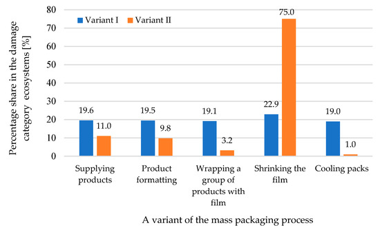 Upon analyzing the results for damage to ecosystems, we noticed similar relationships to those in the previously discussed category of damage (Figure 11). For both variants, the film shrinkage stage had the greatest impact on the impact strength values in this category (22.9% and 75%).