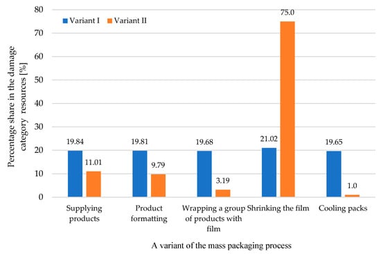 A comparison of the impact of the stages of the mass packaging process on the category of harm to resources for two tested variants (own research).
