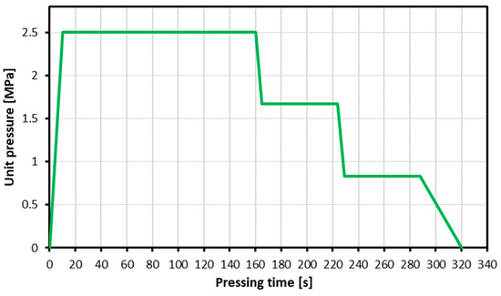 Following the production process for the window frames, a waterproofing layer, a primer, an interlayer, and an appropriate top-coat were applied. The application was carried out by the manufacturer’s recommendations. The window frames prepared this way were seasoned for one year and then re-milled using a laboratory knife milling machine. This laboratory prototype was provided by the Research and Development Centre for Wood-Based Panels Sp. z o. o. in Czarna Woda, Poland, and equipped with knives and counter-knives similar to those in industrial milling machines used for particleboard production. During the particles’ resination, the glue was sprayed over the particles with an air gun while they were being blended in a laboratory mixer. The following resination was applied: 12% and 10%, face and core layer, respectively. No hydrophobic agents were added. The panels had a nominal density of 670 kg m−3, were 16 mm thick, and 32% of the mass was from the face layers. The share of post-consumer particles was 5, 10, 25, 50, and 100 parts by weight. The manually formed mats were initially pre-pressed on a hydraulic press (ZUP-NYSA PH-1P125) at room temperature for 30 s under the maximum unit pressure of 0.9 MPa, then pressed in a hot (200 °C) hydraulic press (AKE, Mariannelund, Sweden) with a press factor of 20 s mm−1 of the nominal thickness of the panel under the maximum unit pressure of 2.5 MPa. The pressing regime is presented in Figure 1. Before the tests, the created boards were conditioned at 20 °C and 65% ambient air humidity to achieve a constant mass, and all samples were calibrated (sanded to the nominal thickness) before testing.