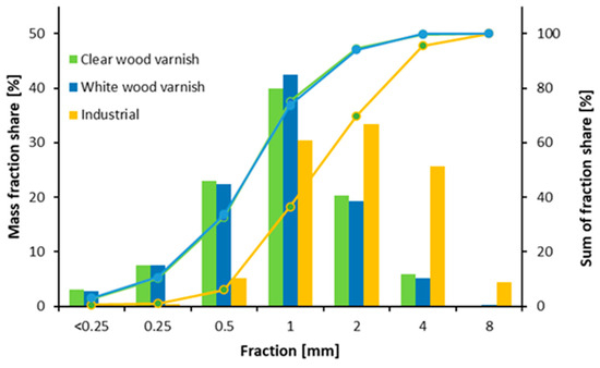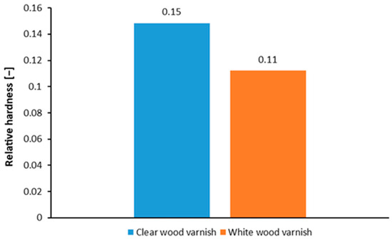 Figure 4 shows the relative hardness of the coatings used. The surface with clear varnish exhibited a higher relative hardness of 0.15, whereas the surface coated with white varnish had a relative hardness of 0.11. This information is crucial when considering the fractional composition of the particles after milling. More complex coatings tend to be more brittle, which can increase the proportion of smaller fractions, specifically those less than 2 mm, or even dust. The values obtained are consistent with other studies [50]. Another study investigated the effect of temperature on various coatings (varnishes were applied to the heated wood), including cellulose lacquer, synthetic varnish, polyurethane varnish, and water-based varnish. The initial heat treatment of the wood did not contribute to the relative hardness of the varnishes used [51]. Varnished wooden surfaces are exposed to various external variables depending on their application. To avoid economic loss, it is critical to select varnishes that provide optimal performance matched to the specific area of application [52]. Studies report that the enrichment of the varnish with TiO2 and Al2O3 nanofillers promotes a reduction in the thickness of the surface layer and thus contributes to the hardness of the coating and the ability to absorb UV radiation [53].