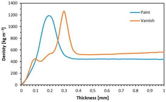 The diagram in Figure 5 shows the relative hardness for the clear varnish and the white paint used in the tests. The blue line shows the density profile of the white paint, which has a lower density and does not penetrate the wood as deeply as the clear varnish (orange line), which may be due to the presence of fillers in the paint. The lack of fillers in the paint makes the paint penetrate the wood better, which can affect some test results, such as water absorption or bulk density. Paint layer thickness can vary greatly depending on solvent evaporation, surface tension gradients, and paint application processes [54], and also, the temperature of the liquid top coating can impact the viscosity of the coating, which therefore affects the dry film thickness on wood surfaces [55]. In addition, the durability of the tested coating was discovered to be better for spruce wood, demonstrating that different wood species can influence the total life and performance of the paint covering [56].