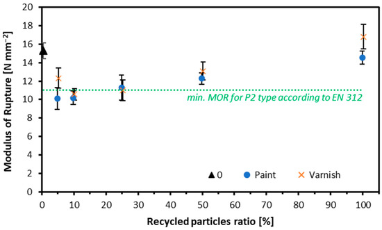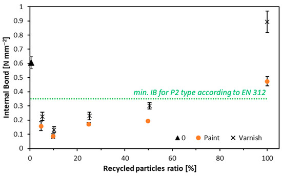 The results for MOR are presented in Figure 6. The MOR value was observed to increase with the amount of recycled content. When analyzing the MOR results for the variant using window frames with white paint, the highest MOR value was recorded for the variant made entirely from recycled particles at 14.5 N mm−2, which is slightly lower than the reference variant at 15.3 N mm−2. The weakest performance was observed in the variant where recycled particles accounted for five parts by mass, with an MOR value of 10.1 N mm−2. For the clear varnish wood, the highest MOR value was achieved by the variant made entirely from recycled particles at 16.8 N mm−2, exceeding the reference value of 15.3 N mm−2. The weakest performance in this category was seen in the variant containing 10 parts by mass of reclaimed wood, with an MOR value of 10.6 N mm−2. The lacquer increases the surface hardness of the particles, which can lead to an enhancement in the mechanical strength of the particleboards. Higher hardness can improve the MOR, as the lacquer coating may serve as an additional protective layer, enhancing resistance to breaking. A similar study investigated the effect of density and bonding on the properties of particleboard made from milled window frames, recording comparable MOR values for boards with a density of 700 kg m−3 [22]. Unfortunately, not all of the produced variants met the MOR standard values. The most promising results were observed in particleboards made entirely from recycled material, and the highest values were recorded for particles from lacquered window frames. Depending on the origin of the raw material used, the density of the particle board may need to be individually tailored, as it largely determines its strength regarding various mechanical properties, including MOR [57].