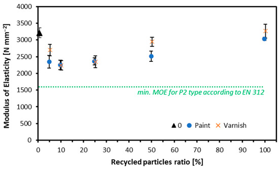 The MOE is shown in Figure 7. The trend is similar to that observed for the MOR: as the recycled wood content increases, the MOE also increases. However, unlike the MOR results, all variants met the standard for MOE. For particleboard made from window frame particles painted white, the highest MOE value was recorded for the variant made entirely from the alternative raw material at 3032 N mm−2, which is lower than the reference value of 3212 N mm−2. The lowest MOE value was observed in the panel where alternative particles accounted for 10 percent, with an MOE of 2251 N mm−2. In the case of specimens made from window frames with clear lacquer, the highest MOE value was also recorded for the variant made entirely from alternative particles, reaching 3665 N mm−2, which exceeds the reference value. Conversely, the lowest MOE was obtained in the variant where the recycled raw material constituted 10 parts by mass, recording a value of 2241 N mm−2. Research confirms that recycled wood can reduce parameters such as the MOE. Nevertheless, the results met the EN 312 standards [58]. During the preparation of the particleboard, dust fractions can also form, for example, when mixing the raw material with the adhesive. Studies confirm that the presence of dust fractions in the core layer of the board can contribute to the weakening of MOE parameters [59].