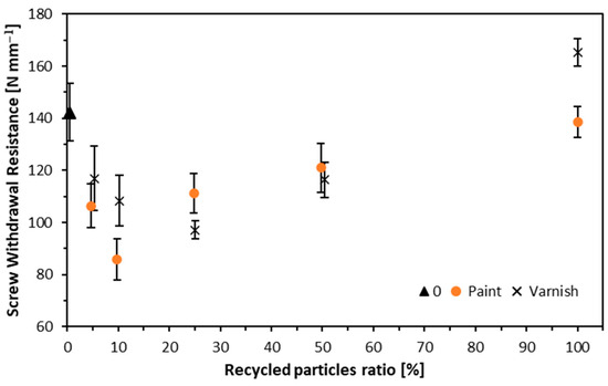 Screw withdrawal resistance is shown in Figure 9. The lowest SWR values were recorded for variants where the alternative crude was 5 (106 N mm−1), 10(86 N mm−1), and 25 (111 N mm−1) parts by weight for particleboards made from white-painted window frames. The highest value was recorded for the variant made entirely from alternative particles—139 N mm−1. For the particleboard made of particles with clear varnish, the highest value was 165 N mm−1; the values obtained were even higher than for the reference board. The lowest SWR value for particleboards made from window frames with clear varnish was recorded for the variant where recycled particles accounted for 25 parts by weight—97 N mm−1. The density of the substance under test determines SWR, which can significantly increase as density increases [62,63]. In contrast, other studies report that recycled wood contributes to lower SWR values [47,64]. Still, it is worth bearing in mind that the recycled raw material and, above all, its form does matter, so it is essential to use more significant fractions, especially in the core layer [65].