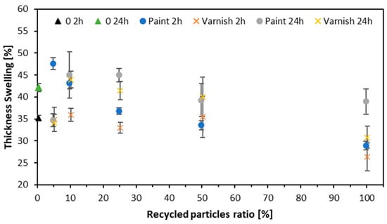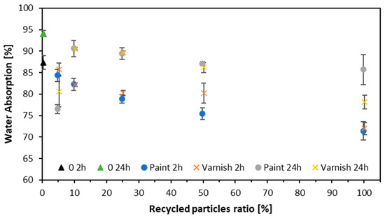 The water absorption diagram is shown in Figure 10. Water absorption decreased as the post-treatment wood content increased after 2 and 24 h. The particleboards made entirely of post-consumer wood and coated with clear varnish exhibited the best dimensional stability. After 2 h, for the variant with 0% alternative raw material (varnish one), the water absorption was 87.4%; and, as the proportion of alternative raw material increased, the water absorption decreased, and for 100%, WA significantly decreased to 75.5%. After 24 h, for the variant with 0% alternative raw material, the water absorption is 94.1%. As the proportion of alternative raw material increases, the water absorption decreases to 87.1% with 100% alternative raw material. For samples made from white-painted window frames, water absorption (WA) after 2 h was 87.4% for the variant with 0% alternative raw material. As the proportion of alternative raw materials increased, water absorption gradually decreased. For the variant with 5% alternative raw material, WA dropped to 84.4%. This trend continued, reaching 78.8% with 25% alternative raw materials. At 50% alternative raw material, WA was 80.3%, and at 100% alternative raw material, it decreased to 72%. For the variant with 0% alternative raw material, water absorption after 24 h is 94.1%. As the proportion of alternative raw materials increases, water absorption decreases. At 5% alternative raw material, WA drops to 76.5%. This trend continues, with WA reaching 90.6% at 10% alternative raw material and 89.5% at 25%. At 50% alternative raw material, WA is 87.1%, and it slightly decreases to 85.7% at 100% alternative raw material. The clear varnish penetrated deeper into the wood (as shown in Figure 5), covering more of the wood surface. This deeper penetration likely contributed to the improved dimensional stability by reducing water absorption. The lacquer reduces the particles’ ability to absorb water, which in turn reduces the risk of swelling and weakening of the structure due to moisture exposure. White paint contains fillers that may be more susceptible to moisture than clear lacquer. A similar situation was obtained when testing particleboards made from other particleboards, where the WA also decreased as the proportion of recycled wood particles increased [47]. Factors influencing WA were also identified; these include the bulk density [66] of the starting raw material or internal bond quality; the weaker the WA, the more dense the bulk of the particleboard [67].