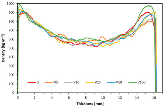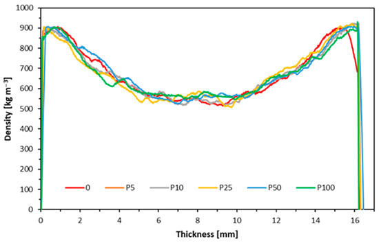 Figure 12. Density profile of composites made from recycled white-painted window frames.