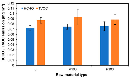 The emission of formaldehyde (HCHO) and total volatile organic compounds (TVOC) was measured on three samples per tested panel using the method described in [47]. Three samples from the reference variant and the variants made entirely from recycled materials were used for this study.