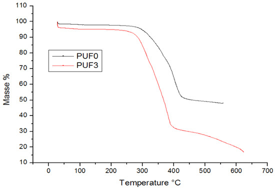 The TGA curves suggest that both PUF0 and PUF3B begin to decompose thermally at around 300 °C. However, PUF0 degrades more rapidly. This indicates and confirms the different compositions or the presence of more easily decomposable components in PUF0 [2].