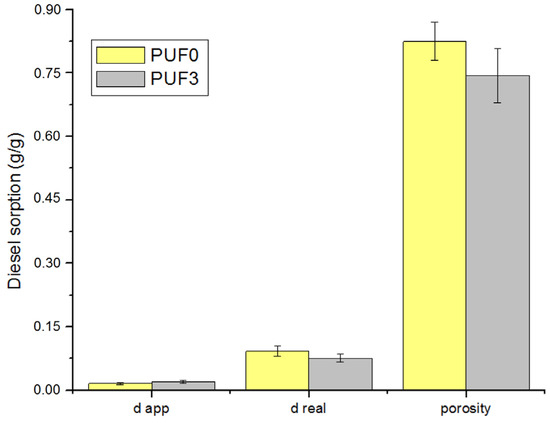 The introduction of fillers, such as algae activated carbon, can alter the density and porosity of the foam composite; Figure 3 shows the apparent density, real density, and porosity of blank foam (PUF0) and the foam composite (PUF3B).