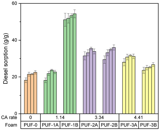 PUF1A and PUF1B (CA content1.14) show a sorption capacity of approximately 22 g/g, while PUF1B is significantly higher at 50 g/g.