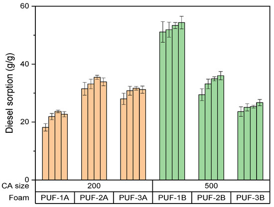 The 200 µm particle size of PUF1A, PUF2A, and PUF3A exhibits a sorption capacity of approximately 22 g/g, while PUF1B, PUF2B, and PUF3B exhibit the highest sorption capacity at approximately 50 g/g. Increasing the algae carbon content initially enhances sorption capacity, but there is a slight decrease at the highest content (PUF3B). The impact of particle size on gasoil sorption capacity is significant, with larger particle sizes (500 µm) achieving approximately 50 g/g. Increasing the algae carbon content from 1.14 mass% to 3.34 mass% enhances sorption capacity, but further increasing it to 4.41 mass% shows a diminishing return in sorption capacity, especially for larger particles.