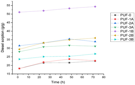 PUF1B (1.14 mass% of 500 µm algae carbon) exhibits the highest overall adsorption capacity of 53 g/g at 72 h, highlighting that larger particle sizes contribute to a higher initial sorption efficiency. Most samples show a gradual increase in sorption capacity over time, demonstrating good stability.