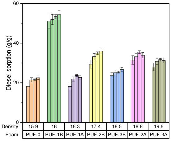 The sorption capacity of polyurethane foams significantly increases with the presence of algae activated carbon. The lowest sorption capacity is observed in blank foam (PUF0), with approximately 20 g/g.