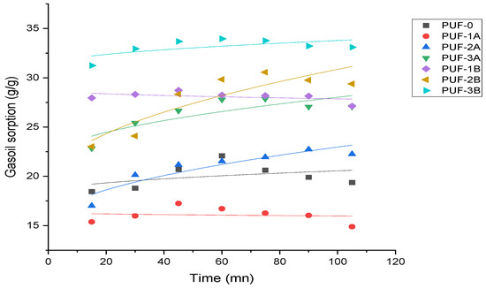 The presence of algae activated carbon significantly enhances the gasoil sorption capacity of polyurethane foams. Larger particle sizes (500 µm) and a higher filler content (2 g) generally result in better performance. For optimal gasoil adsorption applications, using polyurethane foams with 0.5 g of 500 µm algae carbon (PUF1B) is recommended due to its high and stable adsorption capacity. The biocomposite PUF1B exhibited the highest overall adsorption capacity, starting at approximately 50 g/g and increasing to 53 g/g over 70 h, demonstrating high and stable sorption capacity.