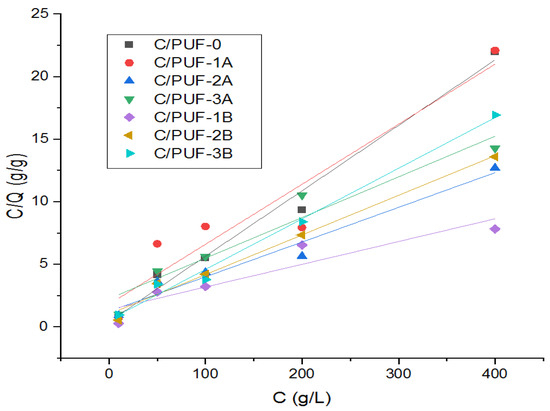 Figure 11 illustrates the Langmuir isotherm correlation between several polyurethane foam (PUF) composites containing varying amounts and particle sizes of algae activated carbon. The Langmuir isotherm is often used to characterize adsorption phenomena, where the ratio C/Q (g/g) is plotted against the concentration of adsorbate in the solution C (g/L) at 1 h 30′.