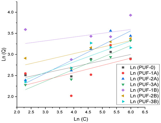 The plot (Figure 12) depicts the Freundlich isotherm relationship for various polyurethane foam (PUF) composites with different amounts and sizes of algae activated carbon. The Freundlich isotherm is typically used to describe adsorption processes in heterogeneous systems, where lnQ is plotted against lnC.