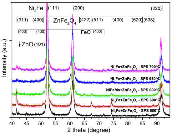 The Ni3Fe@ZnFe2O4 and Supermalloy@ZnFe2O4 pseudo-core-shell powders have been compacted by SPS at 500, 600, 650, and 700 °C without holding time. Figure 2 presents the X-ray diffraction patterns for the SPS-ed compacts produced from Ni3Fe@ZnFe2O4 pseudo-core-shell powders. The Ni3Fe FCC structure Bragg peaks (JCPDS file no. 88-1715) are present in the XRD patterns for all the samples. By increasing the sintering temperature, the FWHM of the maxima decreases, thus indicating that the crystallite size increases. The formation of new phases can be observed, as it is indicated by the presence of new diffraction maxima. The newly formed phases that are present in compacts are identified as being FeO (JCPDS file no. 06-0615) and ZnO (JCPDS file no. 36-1451). We can assume that this new phase forms at the interface between the metallic Permalloy and the zinc ferrite older phases by solid-state reactions. These new phases are expected to have a significant influence on the SPS-ed composite compact characteristics. Both phases that are formed upon sintering have high resistivity, and their presence is a positive aspect related to electrical resistivity. As the sintering temperature increases, the intensity of the maxima of the newly formed phases increases, thus indicating the larger amount of these phases in the composite. Indeed, upon increasing the temperature, a higher mobility of the atoms is assured, and the iron atoms diffuse to the outer layer of the metallic particles and react with zinc ferrite, leading to partial decomposition. Actually, since the zinc ferrite formula can also be written as ZnO∙Fe2O3, an iron atom can react with Fe2O3, leading to its reduction and thus the formation of FeO.