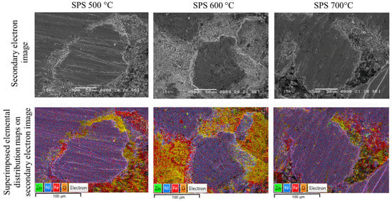 SEM images of SPS-ed and superimposed distribution maps for Ni, Fe, O, and Zn elements in the SPS-ed composite compacts obtained at 500, 600, and 700 °C from Ni3Fe@ZnFe2O4 pseudo-core-shell particles.