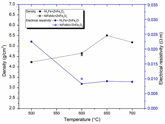 The influence of sintering temperature on the density and electrical resistivity of the composite compacts produced by SPS from Ni3Fe@ZnFe2O4 and Supermalloy@ZnFe2O4 pseudo-core-shell powders is shown in Figure 6.