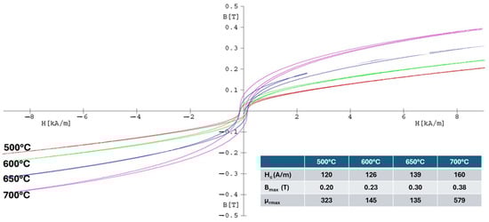 The B–H hysteresis curves in DC of the Ni3Fe/ZnFe2O4 composite compacts, SPS-ed at temperatures: 500, 600, 650, and 700 °C. Holding time was 0 min.