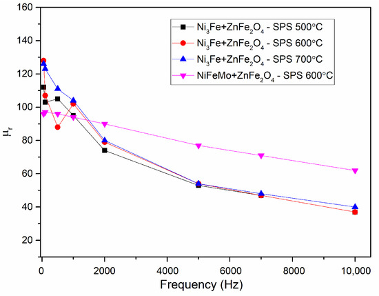 Figure 8 presents the evolution of initial magnetic permeability versus frequency for toroidal-shaped Ni3Fe/ZnFe2O4 and NiFeMo/ZnFe2O4 composite compacts, SPS-ed at the sintering temperature indicated on the graph. The induction level was seated at 0.01 T.
