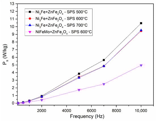 Evolution of the specific power losses vs. frequency for toroidal shaped Ni3Fe/ZnFe2O4 and NiFeMo/ZnFe2O4 composite compacts; SPS-ed at the sintering temperature is indicated on the graph. The induction level was seated at 0.01 T.