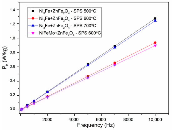 The evolution of the hysteresis losses versus frequency at 0.01 T are presented in Figure 10. It can be noticed that the lower losses are given by the samples sintered at 600 °C. This is related to the samples’ density and composite component phases. For these samples, the sintering temperature is limiting the formation of multiple phases at the interface.