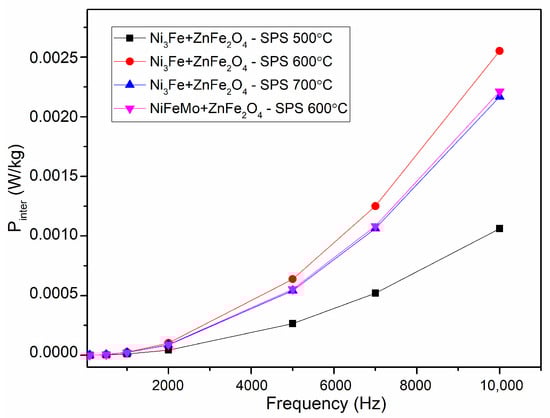 The evolution of the specific power losses versus the frequency for toroidal-shaped Ni3Fe/ZnFe2O4 and NiFeMo/ZnFe2O4 type composite compacts, obtained at the sintering temperature of 500–700 °C at an induction level of 0.01 T, are shown in Figure 9. A similar evolution of the specific power losses was obtained for all the compacts. Thus, the specific power losses increase exponentially with the increase in the testing frequency. The NiFeMo/ZnFe2O4 compact SPS-ed at 600 °C has the lowest losses. This can be related to the larger intrinsic electrical resistivity of the Supermaloy as compared to the one of Ni3Fe. The results are promising; for the induction level of 0.01 T, until a frequency of 2000 Hz, the power losses are smaller than 1.5 W/kg. At the frequency of 10 kHz, the power losses are larger, but still, they remain at a reduced level, smaller than 15 W/Kg. In the case of Supermalloy/ZnFe2O4 composite compact SPS-ed at 600 °C, without holding time, the specific power losses are even lower than 5 W/kg. With a certain attribution of the main part of the losses to the eddy current developed in the SPS-ed toroidal samples, mainly at intra-particles level, a decomposition has been performed. The losses deconvolution has been conducted using the Bertotti classical loss separation model [,]. The total losses are composed of hysteresis losses and dynamic losses when the excess losses are not considered, as in our case. The dynamic losses are divided in two, inter-particles and intra-particles, as it is well known.
