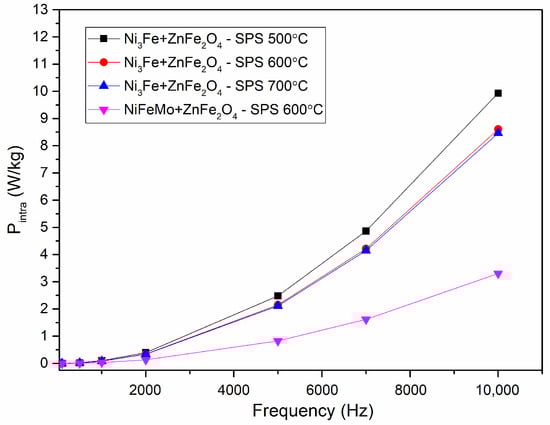 The intra-particles losses are depicted in Figure 12. It can be observed that these losses represent the main part of the losses. The lower intra-particles losses are obtained for the samples containing NiFeMo. This is related to the higher intrinsic electrical resistivity of this alloy compared to Ni3Fe. The use of small particles is suggested and thus will lead to lower intra-particles losses. Also, it can be noticed that the formation of FeO and ZnO in a higher amount has a positive effect on diminishing the intra-particles losses. This is related to the reduction of effective particles size by the reaction on their surface of the iron (provided by Permalloy and Supermalloy) with zinc ferrite. The amount of FeO and ZnO are certainly at a relatively high amount, their maxima are easily visible in diffractograms, and the intensity increases upon increasing the sintering temperature.