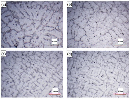 The metallographic microstructure of the Al-5.4Cu-0.7Mg-0.6Ag-xLa alloys is illustrated in Figure 1. As depicted, all alloys exhibit a typical dendritic microstructure. In the base alloy, which lacks the addition of rare earth element La, the grains mainly consist of coarse dendrites, with some equiaxed grains dispersed within, and numerous large undissolved second phases are present along the grain boundaries. As observed in Figure 1b–d, the introduction of the element La results in a reduction in the secondary dendrite arms of the grains, accompanied by an increase in the number of equiaxed grains. Moreover, as the La content increases, the grain size continuously decreases, with the most significant refinement observed in the 0.4 wt.% La alloy. However, with the further addition of La up to 0.6 wt.% La, a trend of coarsening and enlargement of microstructures becomes apparent, accompanied by irregular shapes and sizes of the grains. According to statistical analysis, the base alloy without La exhibits an average grain size of 50 μm, which decreases to 43, 26, and 27 μm after the addition of La. Therefore, the addition of La can significantly refine the grains in the alloy.