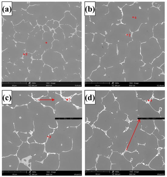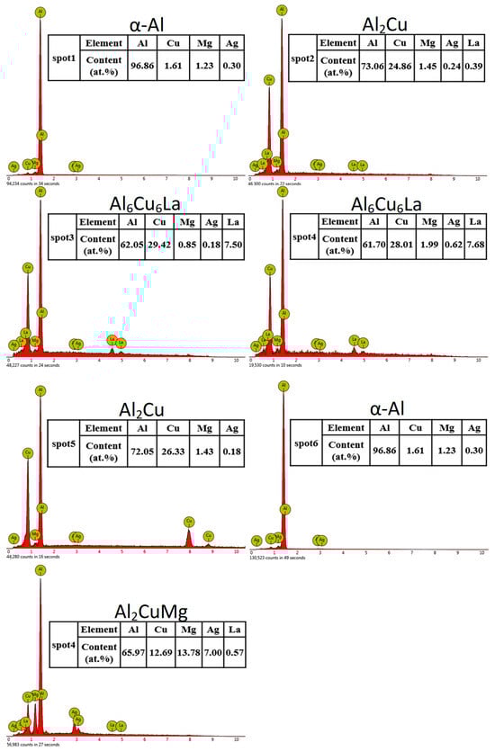 Figure 2 and Figure 3 depict the SEM images and corresponding EDS spectra of the Al-5.4Cu-0.7Mg-0.6Ag-xLa alloys, respectively. Table 3 presents the EDS spectrum analysis results of the Al-5.4Cu-0.7Mg-0.6Ag-xLa alloys. From Figure 2, it can be observed that the alloy’s microstructure is primarily composed of a dark gray α-Al matrix accompanied by numerous reticular second phases. Combining Figure 3 with Table 3, the plate-like or granular material in Figure 2 is speculated to be Al2Cu, while the irregular gray phase precipitated along the edge or in the middle of Al2Cu may be Al2CuMg. The bright white phase precipitated on Al2Cu is possibly Al6Cu6La, with a minor dissolution of Mg and Ag. In the alloy, many undissolved second phases aggregate at grain boundaries, and the introduction of La minimally influences the refinement of these boundaries. However, the continuous addition of La alters the morphology and distribution of the second phase in the alloy. When the La content is equal to or greater than 0.4La, the shape gradually transforms from irregular plate-like to discontinuous skeleton-like. Moreover, the higher the La content is, the more obvious the segregation phenomenon of the Al6Cu6La phase is, and the skeleton-like structure in the alloy is also increased.