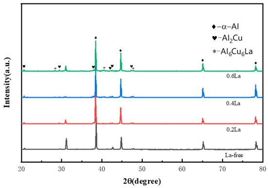 The XRD spectrum of the Al-5.4Cu-0.7Mg-0.6Ag-xLa alloy is shown in Figure 4. From Figure 4, it can be observed that the diffraction pattern of the alloy exhibits strong characteristic peaks of α-Al and Al2Cu phases. It is evident that even after the addition of La, the primary phases of the alloy remain α-Al and Al2Cu. Furthermore, upon observation of the spectrum, it can be noted that with the addition of La, the diffraction peaks of the Al2Cu phase begin to weaken, primarily due to the reduction in the quantity of eutectic Al2Cu phase at the grain boundaries after La addition (as shown in fig4). Additionally, in the La-added alloy, the presence of the Al6Cu6La phase is observed. As a newly formed phase, Al6Cu6La not only affects the mechanical properties of the alloy at room temperature but also influences the mechanical properties of the alloy at high temperatures due to its thermal stability [13].