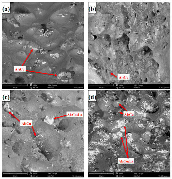 Along the edge or in the middle of Al2Cu, irregular gray Al2CuMg phases precipitate as coarse residual secondary phases, acting as crack initiators, which reduce the ductility of the aluminum alloy [42]. From Table 3 and Figure 5, it can be observed that the rapid decrease in the elongation of the 0.2 wt.% La and 0.4 wt.% La alloys is related to this block-like secondary phase. Thus, the formation of Al2CuMg phases is identified as the cause of the mechanical performance decrease at room temperature.