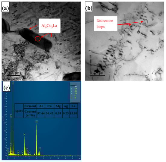 The microstructure at the grain boundary and the dislocation relationship of the precipitated phase of the Al-5.4Cu-0.7Mg-0.6Ag-0.6La alloy are depicted in Figure 8. From Figure 8a and the energy spectrum corresponding to point 1 in Figure 8c, we can see that the Al6Cu6La phase exhibits a blocky morphology and enriches at the grain boundary. In Figure 8b, we observe a dislocation entanglement caused by the interaction of moving dislocations during the tensile process. According to the theory of combined dislocations, when external stress increases, dislocations are forced to move forward and bend around second-phase particles and other inclusions in the alloy, leaving dislocation loops. These products exert a repulsive force on the dislocation loops. The mutual accumulation of dislocations also causes them to be affected by pile-up stress, making the dislocation loops stable under the combined forces after the external force is removed.