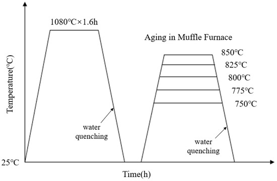 The composition of the novel nickel–iron-based alloy was analyzed using the electron probe microanalyzer analyzer (EPMA, JXA8230, JEOL, Tokyo, Japan) with a surface scan performed at a voltage of 20 kV, as detailed in Table 1. Due to the necessity of eliminating the dendritic and precipitated phases inherent in the material before aging [9,35], a complete solution treatment was required prior to the aging process. Three 50 mm × 30 mm × 25 mm samples were solution-treated at 1080 °C. To avoid the oxidation and hardened layer, a uniform 2 mm-thickness layer was removed from all exposed sides. Then, samples were cut into 15 mm × 10 mm × 8 mm specimens. After resistivity measurement, the solution-treated specimens were placed in a muffle furnace for aging at 750 °C, 775 °C, 800 °C, 825 °C, and 850 °C for 0.5 h to 20 h. The heat treatment process is illustrated in Figure 1.